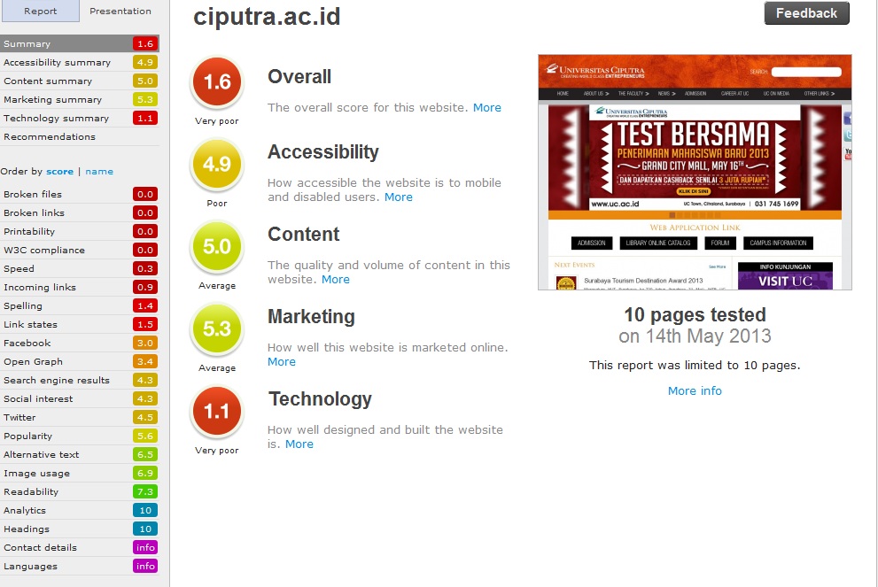 Jika dilihat dari hasil kalkulasi keseluruhan dari website tersebut. Bisa dikatakan bahwa hasil evaluasi dari website tersebut bisa dikatakan sangat buruk itu terlihat dar nilai Overall-nya yang hanya mencapai 1.6. Nah, selain itu berikut merupakan beberapa parameter yang menjadi penilaiannya :
